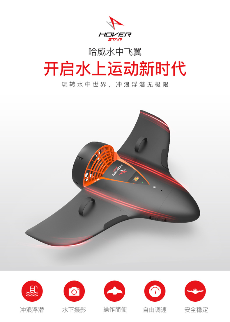 ??深潛:可搭配潛水服、呼吸管、面罩、腳蹼等潛水設備,進行深海潛水,來一次海底世界的激情探險,和水里的群魚蝦蟹來一次親密接觸。 ??浮游:借助水中飛翼,可以輕松實現(xiàn)浮游,你可以單純的游泳,也可以短暫的潛入水中,像魚兒一樣,一會兒將頭部露出水面呼吸,一會兒潛入水里遨游前行。 ??沖浪:喜歡刺激者可以順著海浪漂流,體驗沖浪帶來的刺激感。 ??產(chǎn)品優(yōu)勢 ??功能多樣化:水中飛翼是一款集深潛、浮游和沖浪于一體的水上娛樂產(chǎn)品,滿足了人們對海洋的所有需求。 ??操作簡便:僅僅兩步就能輕松啟動:左扶手處設置有開關,右扶手處設置有速度按鈕,用戶只需要左手壓下開關(保持下壓狀態(tài)),右手按下速度按鈕,即可啟動。此外,僅通過體感就可以控制方向,簡單地說,就是向左調(diào)轉水中飛翼,就可以實現(xiàn)左轉;向上抬升,進入浮游狀態(tài);向下按壓,進入潛水狀態(tài),以此類推。 ??三檔速度:水中飛翼提供低、中、高三檔速度可供選擇,默認速度為一檔,每按一次提升一檔,依次循環(huán)。 ??滑行穩(wěn)定:水中飛翼外形酷似去掉機尾的飛機,具有平衡、穩(wěn)定和操作性強的特點。 ??水底攝影:機身正面設置有水下相機安裝位置,用戶可以根據(jù)需要安裝水下相機,全程記錄水中旅程,并分享給親朋好友