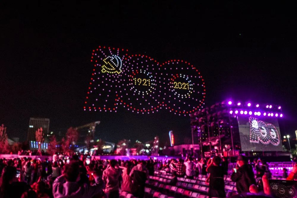 ?當晚21時許,千架無人機編隊以天空為幕,以“熒光”為筆,由飄動的紅綢、黨徽、1921-2021字符組合的圖案率先在夜空中亮相。而后,無人機編隊組合出“不忘初心 牢記使命”“聽黨話 跟黨走”一句句鏗鏘有力的話語,引得現場觀眾連連贊嘆。蘭州城市地標圖案中山橋、奧體中心、萬達茂隨后也紛紛驚艷亮相,與星空共舞,把當晚金城夜空描繪得璀璨而華麗。
