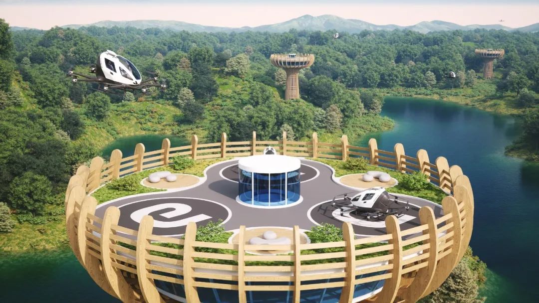 GZDG設計該航站樓的靈感來自于非洲樹種猴面包樹,基于這一天然的建筑造型,航站樓將包含一座30米高的鋼結構和疊層木結構的塔樓、候機室、咖啡廳、200平方米的全景餐廳和接駁電梯。自動駕駛飛行器的起降機場將被設置在航站樓的頂層平臺上。以可持續發展為核心設計理念,航站樓將使用綠色能源,其防滑光伏板每天可產生超過300度電的電能。該平臺將提供完全獨立的即插即用充電基礎設施,可用于給億航智能自動駕駛飛行器充電。以“猴面包樹”航站樓為起點,億航智能和GZDG致力于共同探索新興的全球生態旅游領域,有望在歐洲和東南亞等多個地區啟動相關項目。