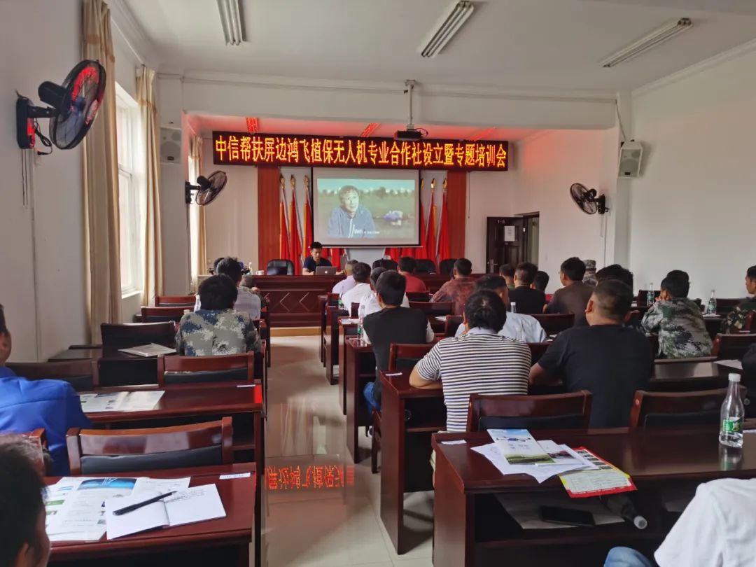 中信集團投入幫扶基金扶持屏邊開展植保無人機產業項目,屏邊縣農業產業植保無人機應用示范項目采用“政府+村集體+服務站+合作社+公司”模式實施。中信公司出資由政府為相關村集體購置二十臺極目植保無人機設備,村集體委托由屏邊縣鴻飛植保無人機專業合作社對這些設備進行運營及管理,及設立服務站。