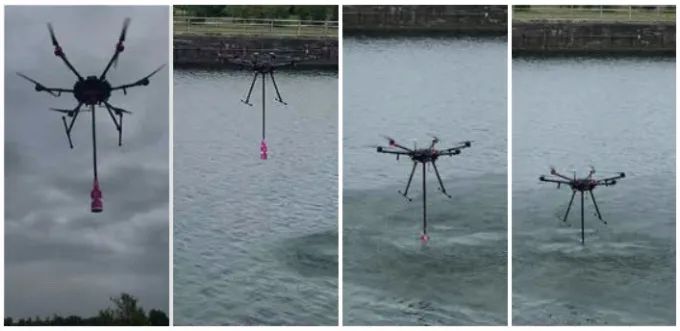 樣品收集器基本上是一個長的垂直臂,有一個鎖住樣品容器的籠子。用戶把空的容器放進去,讓無人機飛出去,然后把收集臂浸入水中。當它飛回來的時候,可以在無人機盤旋的時候把裝滿的容器拿出來,然后把一個新的容器放在它的位置上,帶到下一個地點去。該公司說,這種切換可以在高達18英里/小時的風速下安全完成,并在高達5節的水流中取樣。