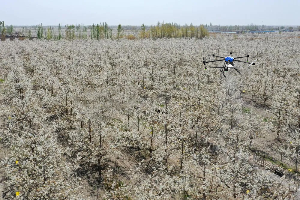 梨花授粉有了新“神器”。在庫(kù)爾勒香梨的產(chǎn)地巴音郭楞蒙古自治州,往年梨花主要靠人工或者蜜蜂授粉。現(xiàn)在,無(wú)人機(jī)成功替代蜜蜂執(zhí)行高效液體授粉作業(yè)。這項(xiàng)技術(shù)將使梨農(nóng)從繁重的授粉工作中解脫出來(lái),提高了生產(chǎn)效率。
